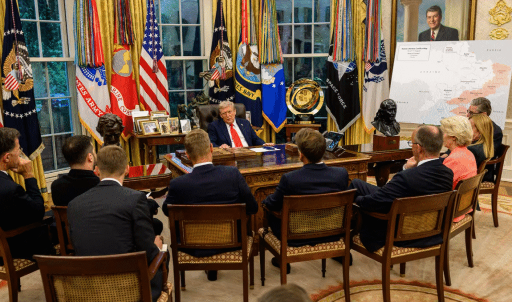 نشر حساب البيت الأبيض على منصة “إكس”، اليوم الثلاثاء، صورة للقادة الأوروبيين مجتمعين مع الرئيس دونالد ترامب، في المكتب البيضاوي معلّقاً: “يومٌ تاريخيٌّ في البيت الأبيض، حيث انضمّ قادةٌ أوروبيون إلى الرئيس ترامب في المكتب البيضاوي”.