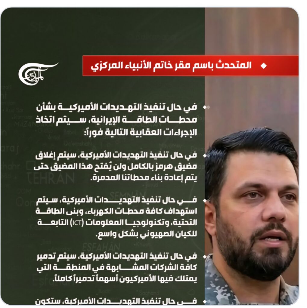 ردّ المتحدّث باسم مقرّ خاتم الأنبياء المركزي، المقدّم إبراهيم ذو الفقاري، على استمرار السلوك العدواني للرئيس الأميركي دونالد ترامب وزعزعته للأمن العالمي، بشأن تهديده استهداف محطات الطاقة الإيرانية “ما لم يتمّ فتح مضيق هرمز”.