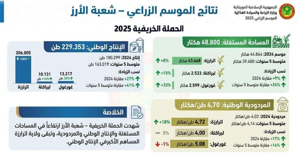 وسجلت ولاية غورغول أعلى مردودية على المستوى الوطني بـ 5,08 طن للهكتار، تلتها الترارزة بـ 4,72 طن للهكتار، في حين بلغت المردودية في لبراكنة 4,00 طن للهكتار.