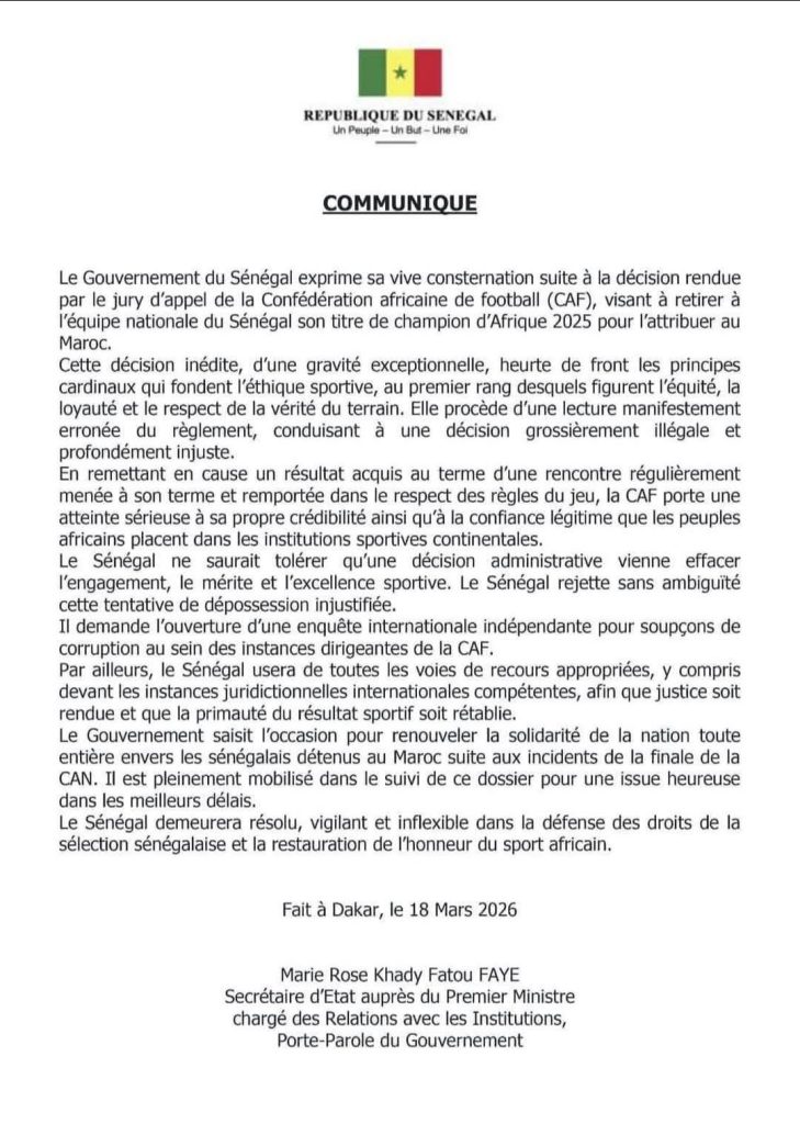 نددت الاتحادية السنغالية لكرة القدم، مساء الثلاثاء، بالقرار الصادر عن لجنة الاستئناف التابعة للاتحاد الإفريقي لكرة القدم (كاف)، والذي يقضي بسحب لقب كأس الأمم الإفريقية الأخير من منتخب السنغال ومنحه للمغرب، واصفة القرار بأنه «مجحف وغير مسبوق وغير مقبول».