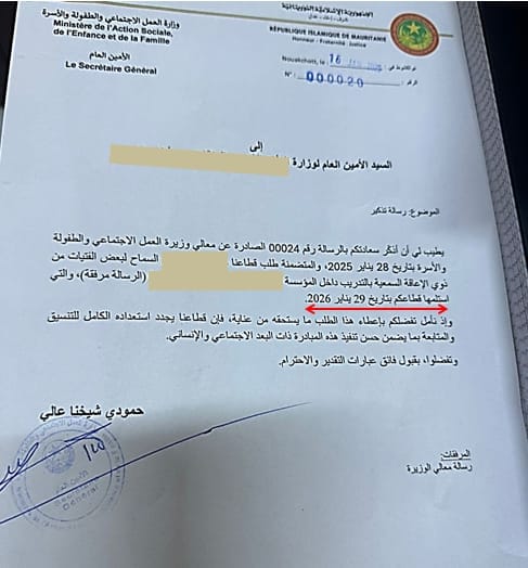 رغم الدعاية والحملات الاعلامية التي ترصد لها هذه الوزارة قناة خاصة بها (قناة الأسرة) بميزانية 85 مليون، وادعائها الاهتمام الكبير بالفئات الهشة، وعلى رأسها الأشخاص المعاقون، فإن واقع الأشخاص المعاقين ووكلائهم، مختلف تماما، فيكفي أن نعرف أن هذه الوزارة عاجزة عن توفير عكاز أو كرسي متحرك، كما أن هناك آلاف المعاقين الذين دفعوا ملفات مستوفية الشروط للحصول على تأمين صحي، ولكن دون جدوى، واليوم أضع بين أيديكم نموذجا حيا لاستهتار وزارتكم بشأن المعاقين، وذلك من خلال هاتين الرسالتين المرفقتين، لنعرف مدى الإهمال الكبير لموضوع بالغ الأهمية ويتعلق بمستقبل 11 شابة معاقة سمعيا، هن خريجات، ما يسمى مجازا، بمركز التكوين والترقية الاجتماعية للأطفال ذوي الإعاقة، حيث بعثت السيدة الوزيرة بالرسالة الأولى بتاريخ: 2025.01.28 إلى مؤسسة عمومية تطلب منها “تدريبهن واكتتابهن”، واستلمتها الجهة المعنية بتاريخ: 2025.01.29، وبدلا من التواصل مع هذه الجهة، ومتابعة هذه المراسلة، بعد شهر أو شهرين من الإرسال للتذكير بالموضوع، جاء التذكير بناء على إلحاح وكلاء هذه الفتيات، فكان التذكير، عبر الرسالة رقم 20، بتاريخ 15 يناير الجاري 2026، صادرة عن الأمين العام للوزارة، أي بعد سنة من الرسالة الأولى، وانتقل المضوع من طلب للتدريب والاكتتاب إلى مجرد “طلب للتدريب”، فقط، كما تضمنت الرسالة خطأ جسيما في التاريخ، وذلك عبر العبارة التالية: “(الرسالة المرفقة) والتي استلمها قطاعكم بتاريخ: 29 يناير 2026″؟ وهو التاريخ الذي لم يحن بعد، فجاء إذن هذا التذكير متأخرا، وبسقف أقل من الأول، وبتاريخ مغلوط.