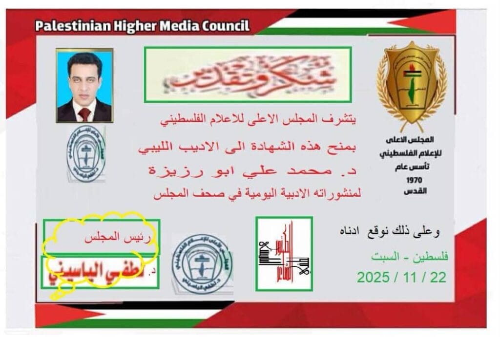 المجلس الأعلى للإعلام الفلسطيني يمنح الأديب الليبي أبورزيزة شهادة شكر تقديرًا لأعماله الأدبية