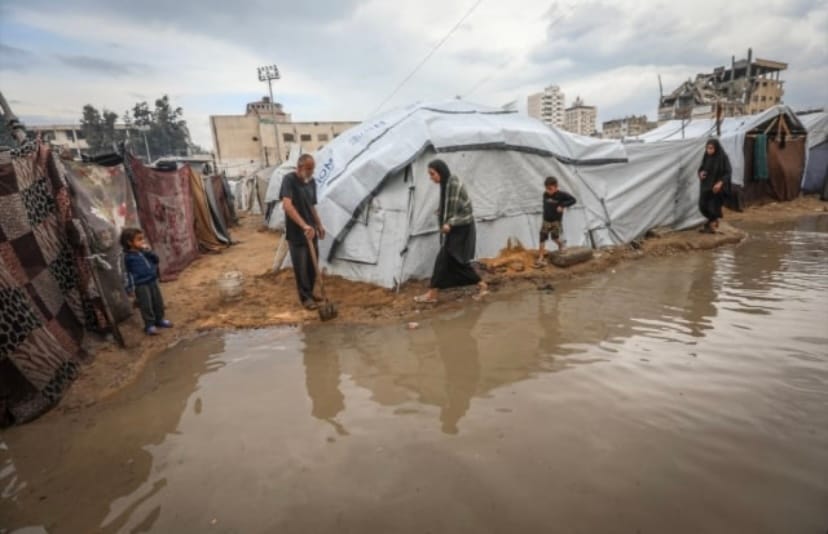 ومنذ فجر أمس الجمعة، تتأثر الأراضي الفلسطينية بمنخفض جوي مصحوب بكتلة باردة ورياح قوية وأمطار غزيرة، ما زاد من معاناة نحو مليون ونصف المليون نازح في القطاع، بعد أن أغرقت مياه الأمطار خيامهم المتهالكة.