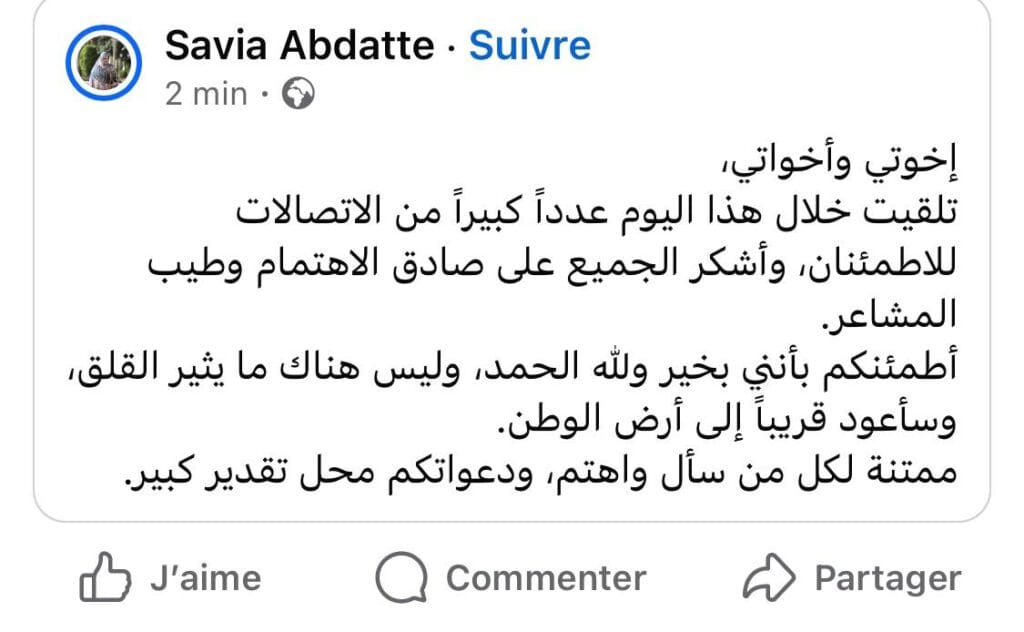 يذكر أن الوزيرة صفية طمأنت الجميع على صحتها وقالت إن الأمر لا يدعو للقلق مؤكدة أن دعوات الجميع محل تقدير