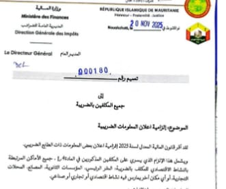 أصدر المدير العام للضرائب، المختار السالم المنى، تعميماً جديداً يفرض إلزامية الإعلان عن المعلومات الضريبية، وذلك تطبيقاً لأحكام قانون المالية المعدَّل لسنة 2025.