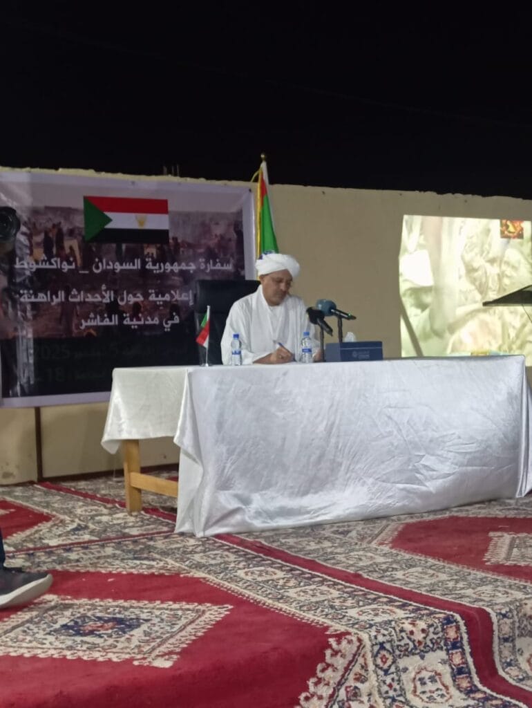 استعرض القائم بأعمال السفارة السودانية في موريتانيا، السفير عبد الحميد بشرى، تطورات الأحداث التي شهدتها مدينة الفاشر خلال الأيام الأخيرة، على وقع الانتهاكات الوحشية والعمليات القذرة التي عرفتها المدينة بعد دخول ميليشيات الدعم السريع إليها في 26 من شهر أكتوبر المنصرم، بعد حصار خانق دام أكثر من سنتين.