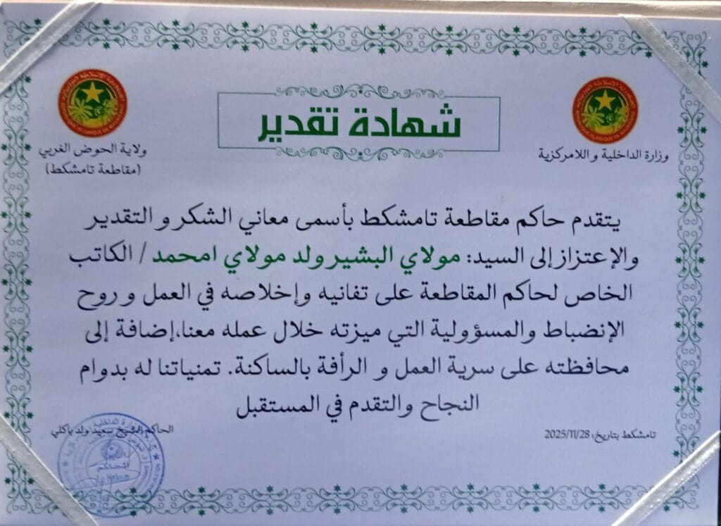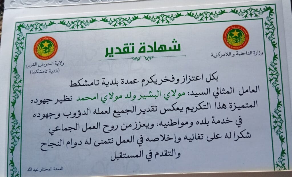 كرم حاكم مقاطعة تامشكط بولاية الحوض الغربي، الشيخ سعيد باكيلي، الكاتب الخاص للمقاطعة الشاب مولاي البشير ولد مولاي امحمد وذلك تقديرا لتفانيه في خدمة المواطنين وتقريب الخدمات منهم حيث منحه الحاكم شهادة تقدير على حسن أدائه.