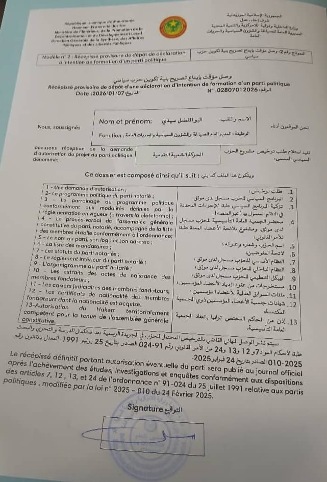 استدعت وزارة الداخلية الموريتانية بعد ظهر اليوم رؤساء تسعة أحزاب سياسية استوفت جميع إجراءات وشروط الترخيص المنصوص عليها في قانون الأحزاب السياسية الجديد في موريتانيا.