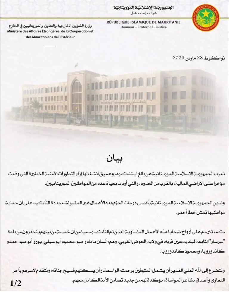 عبرت موريتانيا عن بالغ استنكارها وعميق انشغالها إزاء التطورات الأمنية الخطيرة التي شهدتها الأراضي المالية مؤخرًا، قرب الحدود، والتي أسفرت عن مقتل عدد من المواطنين الموريتانيين.