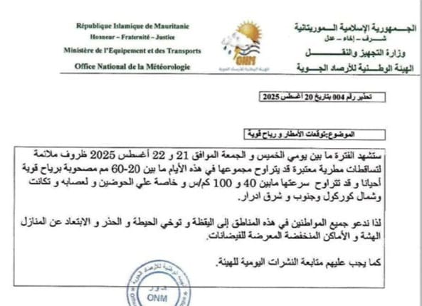 موريتانيا: تحذير سكان ست ولايات من أمطار مصحوبة برياح قوية اليوم وغدا