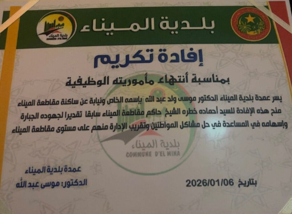 في لحظة وفاء نادرة، اختارت الساكنة الشعبية والسياسية في مقاطعة الميناء، وفي طليعتها عمدة المقاطعة، أن تترجم امتنانها وتقديرها في حفل تكريم يليق بالرجل الذي جعل من الوظيفة الإدارية رسالةً أخلاقيةً قبل أن تكون مسؤوليةً قانونية، وهو السيد أحمادة ولد خطرة ولد الشيخ، حاكم مقاطعة المناء، الذي ودّع الوظيفة بعد مسيرة طويلة مفعمة بالوطنية، والنزاهة، والكفاءة.