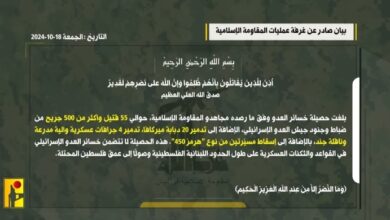 حزب الله: خسائر العدو بلغت 55 قتيلا وأكثر من 500 جريح و 20 دبابة ميركافا و 4 جرافات